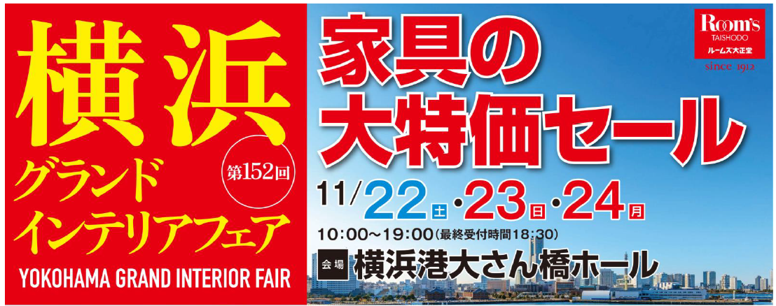 2025年11月22日(土)~24日(月祝)まで横浜港大さん橋ホールにて第151回横浜グランドインテリアフェアを開催いたします。会場特別価格の家具が、JAF通年優待でさらに5%割引に♪