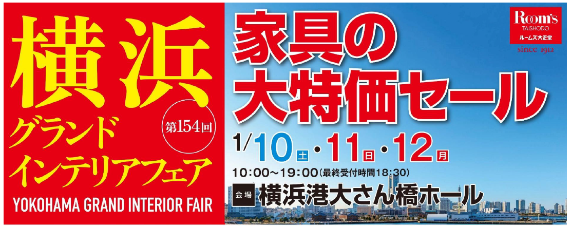 2026年1月10日(土)~12日(月祝)まで横浜港大さん橋ホールにて第151回横浜グランドインテリアフェアを開催いたします。会場特別価格の家具が、JAF通年優待でさらに5%割引に♪