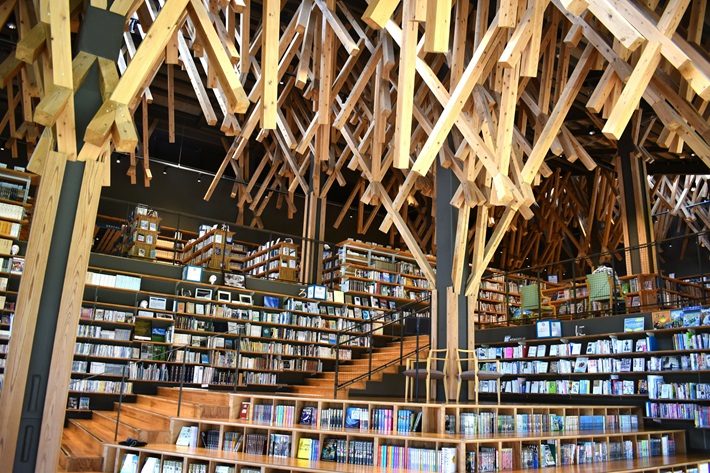 梼原産の木材をふんだんに使用した図書館です。天井には、伝統的な木組み技法が使われています。地元の人々や観光客が利用する憩いの場であり、カフェコーナーやボルダリング設備が併設されています。