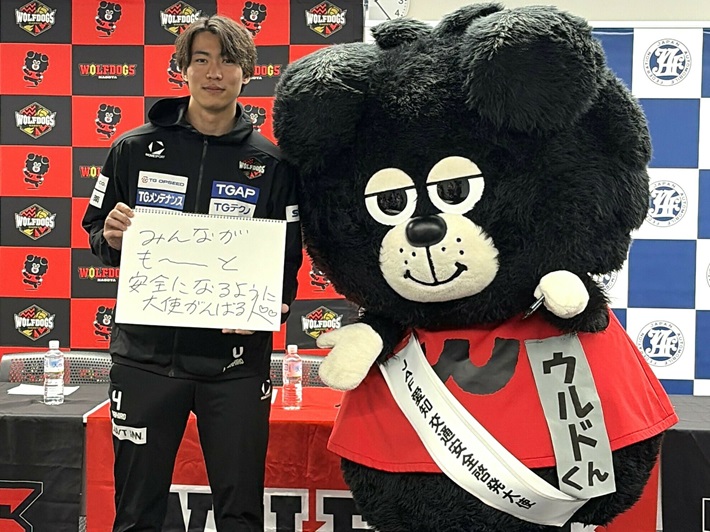 JAF愛知支部は、これまでロードサービスの提供に加え、交通安全講習会や交通安全イベントを開催するなどの啓発活動を通じて、地域の交通事故防止と安全意識の向上に取り組んでまいりました。一方、ウルフドッグス名古屋は、愛知県を拠点に活動するトップレベルのバレーボールクラブとして、多くのファンや地域住民に親しまれています。さらに、スポーツを通じた地域貢献活動にも積極的に取り組んでいます。このたび、スポーツが持つ発信力・影響力と、JAFの交通安全に関する専門的知見を掛け合わせて連携・協力することにより、愛知県内における交通安全啓発活動を推進し、交通事故の防止および交通安全意識の向上を図り、地域社会の安心・安全に寄与することを目的に、連携協定を締結する運びとなりました。また、ウルフドッグス名古屋チームマスコット「ウルドくん」を「JAF愛知 交通安全啓発大使」に委嘱する委嘱式を同時開催いたしました。今後、ウルドくんは交通安全啓発イベントや広報活動を通じて、交通安全の重要性を広く発信していきます。