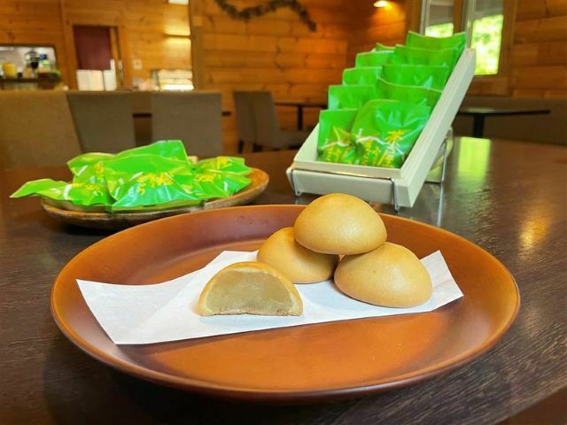 敦賀市の野坂山のふもとある野坂茶屋は老舗和菓子店「松原庵」が手がけるカフェです。自然に包まれた落ち着いたログハウスの建物で、和スイーツから軽食、お食事まで幅広く楽しめます。「みるくまんじゅう」はバターやクリームをたっぷり使った生地に、みるく黄身あんを包んだ焼きまんじゅうです。