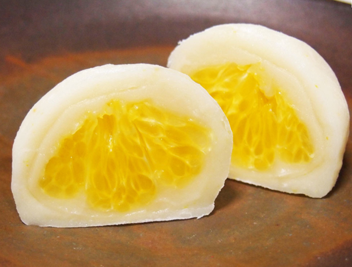 みずみずしい八朔を白餡で包み、さらにみかんの皮を練り込んだ「みかん餅」でふんわりと包み込むことで、三つの素材が織りなす上品な味わいが生まれます。