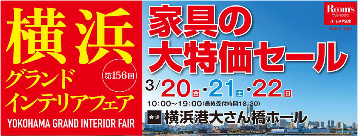 2026年3月20日(金・祝)~22日(日)まで横浜港大さん橋ホールにて第156回横浜グランドインテリアフェアを開催いたします。会場特別価格の家具が、JAF通年優待でさらに5%割引に♪