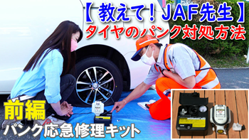 YouTuberの木村亜美さんにタイヤがパンクした時の対処法について、JAF先生に教わりながら体験していただきました。前編ではタイヤのパンク応急修理キットの使い方や押さえておくべきポイントについて、JAF先生が解説します!ぜひ、日頃の交通安全にお役立てください♪