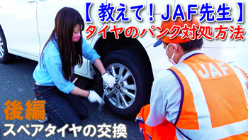 YouTuberの木村亜美さんにタイヤがパンクした時の対処法について、JAF先生に教わりながら体験していただきました。後編ではスペアタイヤの交換方法について安全に交換するポイントや注意点を、JAF先生が解説します!ぜひ、日頃の交通安全にお役立てください♪