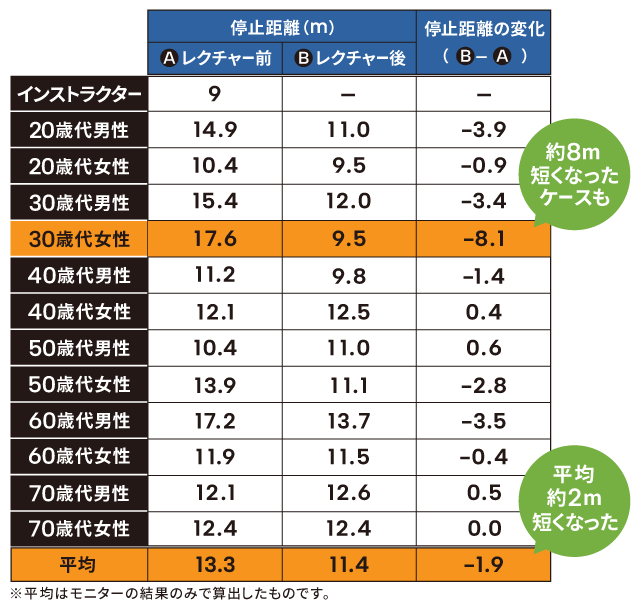 - JAFインストラクターのレクチャー前後で平均約2m停止距離が短くなった。