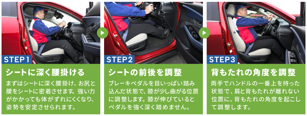 運転前に3ステップで調整を。慣れないと窮屈かもしれませんが、これが適切な運転姿勢です。