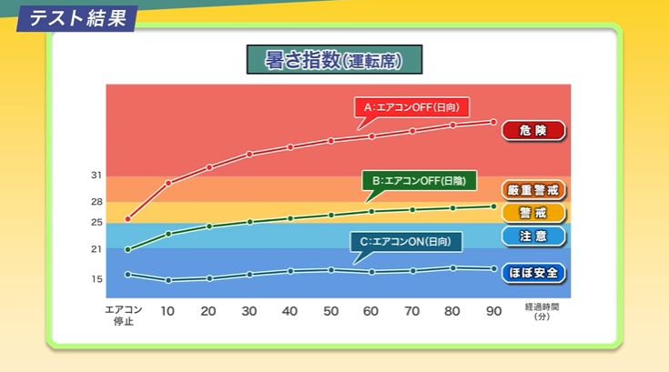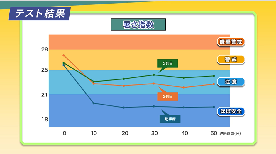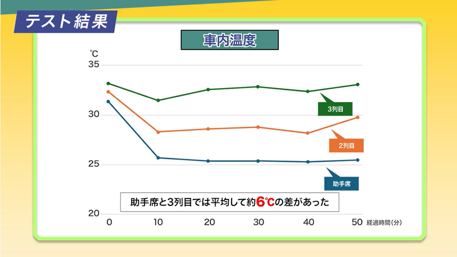 車内温度を測定したところ、助手席と3列目では平均して約6℃の差があり、暑さ指数は助手席は「ほぼ安全」レベル、2列目、3列目では「注意」レベルを示した。