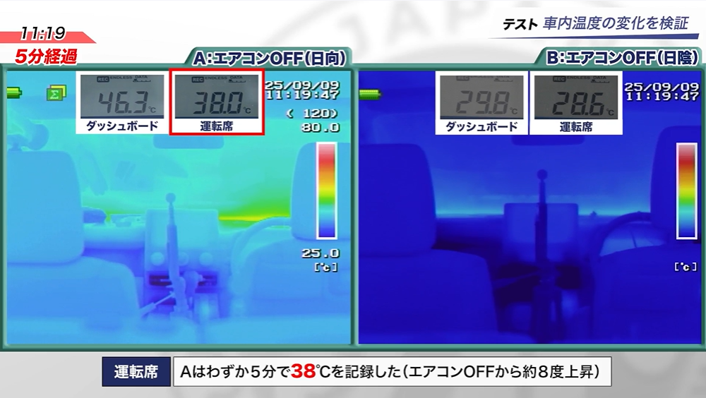 日向に駐車した場合、エアコン停止からわずか5分で運転席の車内温度は38℃を記録した。最終的には53℃に達し、暑さ指数は「危険」レベルを大きく上回る結果となった。一方、日陰に駐車した場合は、温度上昇を大幅に抑えたものの、運転席の車内温度は33℃に達し、暑さ指数は「警戒」レベルを示した。