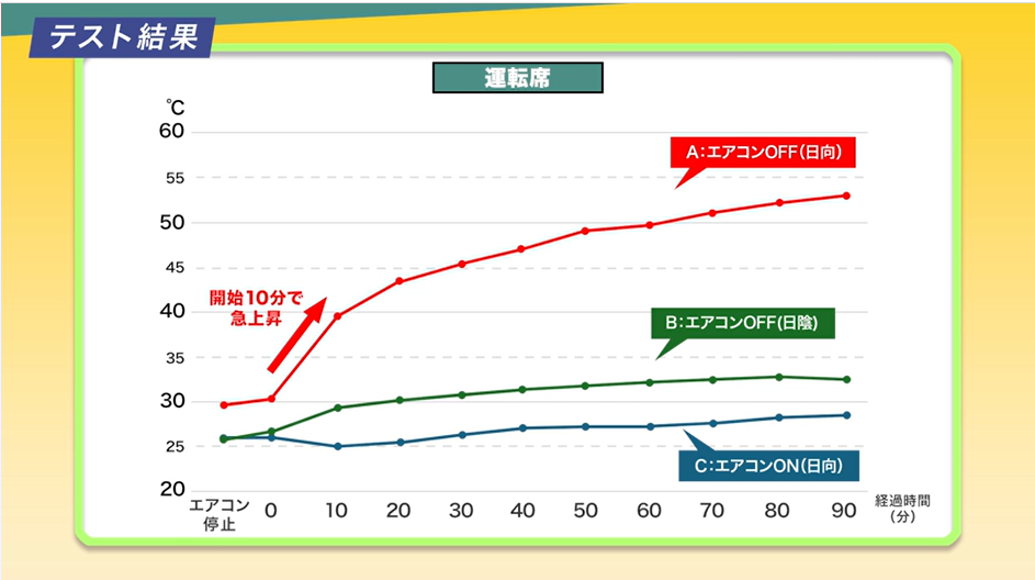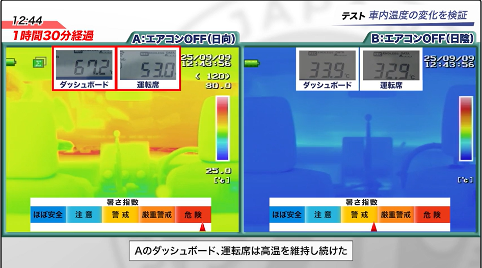 - 真夏の日向に駐車した場合、運転席の車内温度は53℃に達し、暑さ指数は「危険」レベルを大きく上回る結果となった。