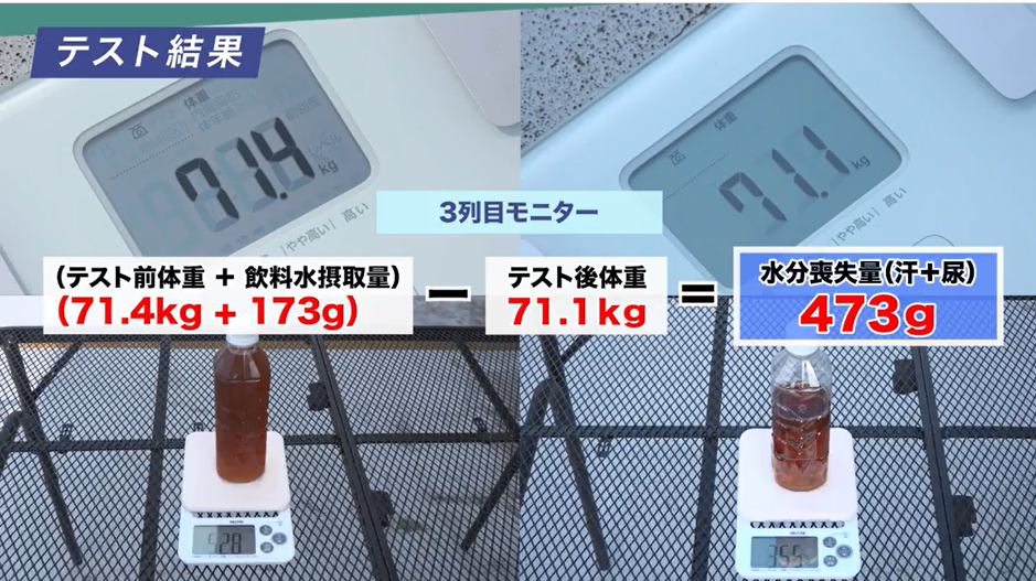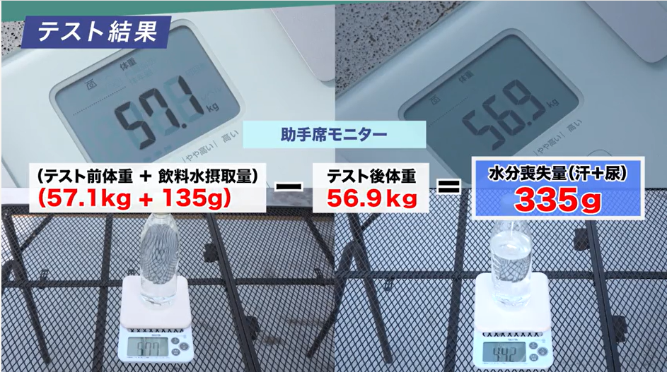 約1時間の実験で助手席は335g、3列目では473gと500mlペットボトル1本分に近い水分量が失われた。
