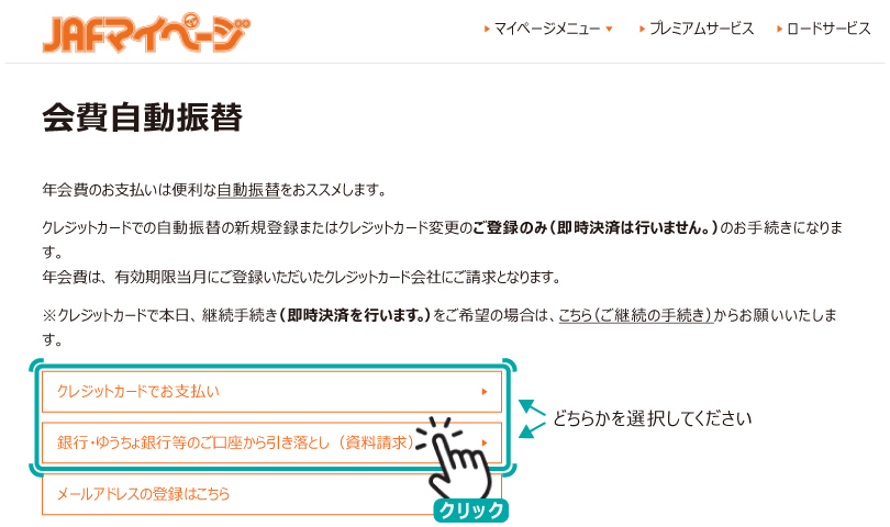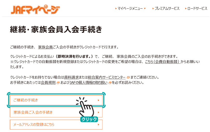 現在のお客様⾃⾝のお⽀払い⽅法を確認したい場合は、JAFマイページにアクセスいただき、「会員登録情報」⇒「ご継続方法」をご参照ください。