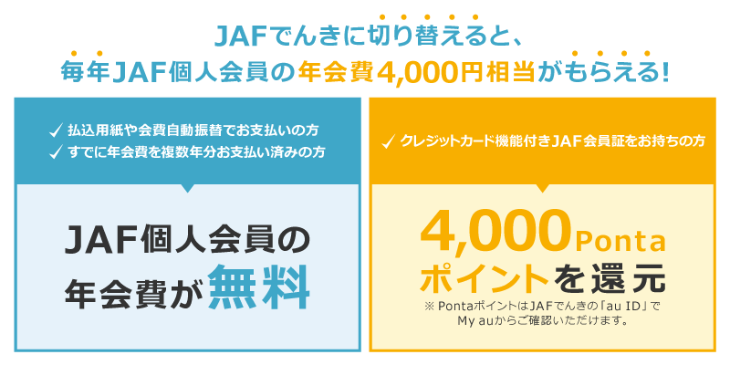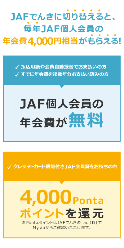 ご自宅の電気使用契約を「JAFでんき」に切り替えていただくことで、JAF個人会員年会費4,000円※が特典として還元されます。お申し込み・開通時期によっては特典付与が翌年以降になる場合がございます。
