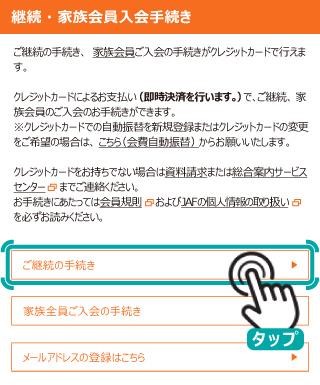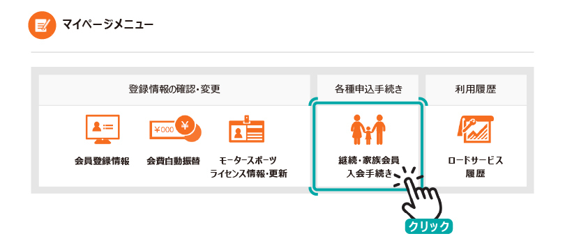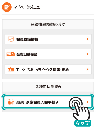 マイページメニューの「継続・家族会員入会手続き」よりお手続きください。